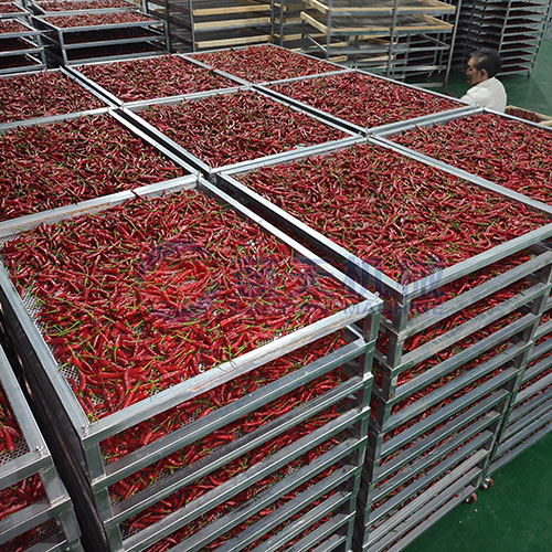 工人將辣椒均勻鋪在辣椒烘干機物料盤上
